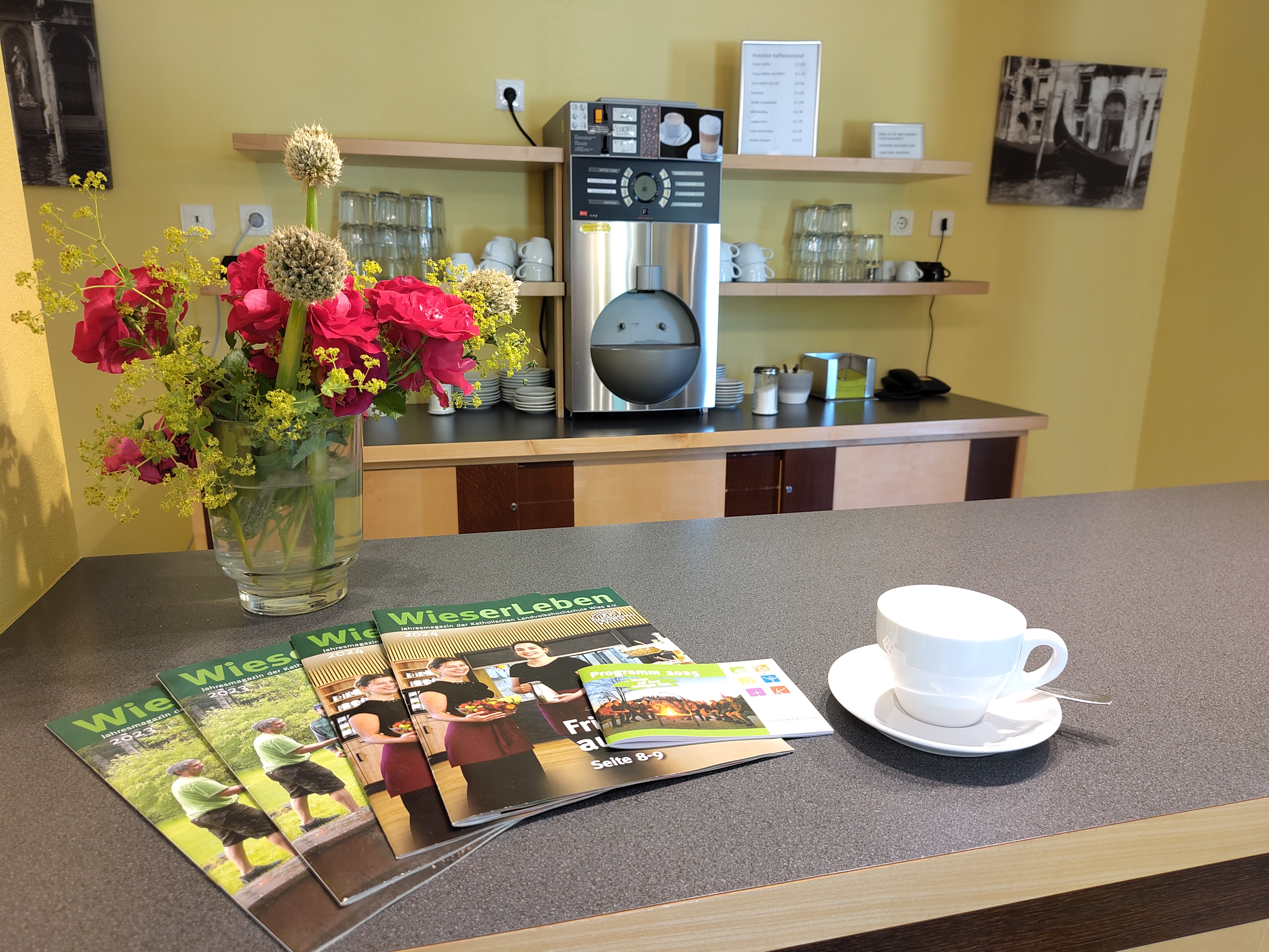 Unsere Cafeteria im Durchgang zum Ostflügel ist ein beliebter Treffpunkt in den Seminarpausen. Sie können dort rund um die Uhr Kaffeegetränke wie Espresso oder Cappuccino, heiße Schokolade und Tee genießen.